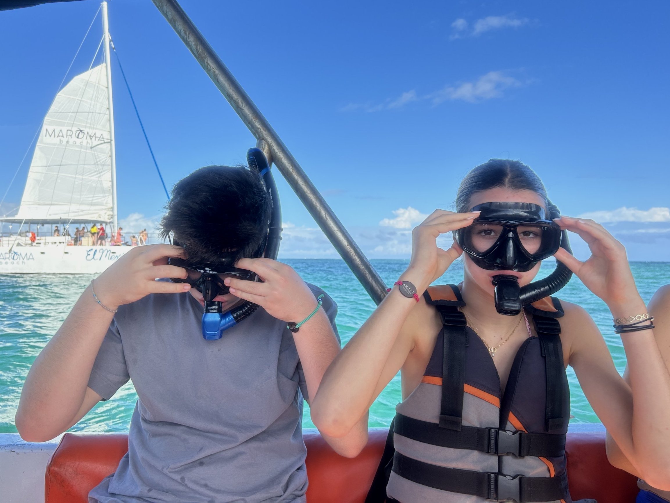 My brother and sister ready to dive into the unexpected, from my snorkelling mask’s pov.